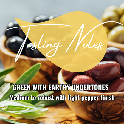 With a fresh fruity aroma, Greek Kalamata olives are probably one of the most well-known varietal in the United States (as an olive to eat). This extra virgin olive oil has a medium to robust profile and finishes with a mild black pepper kick. Full flavored and earthy. This oil is a great dipping oil for all palates.