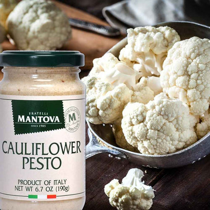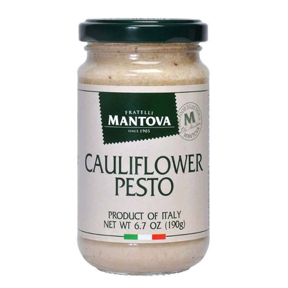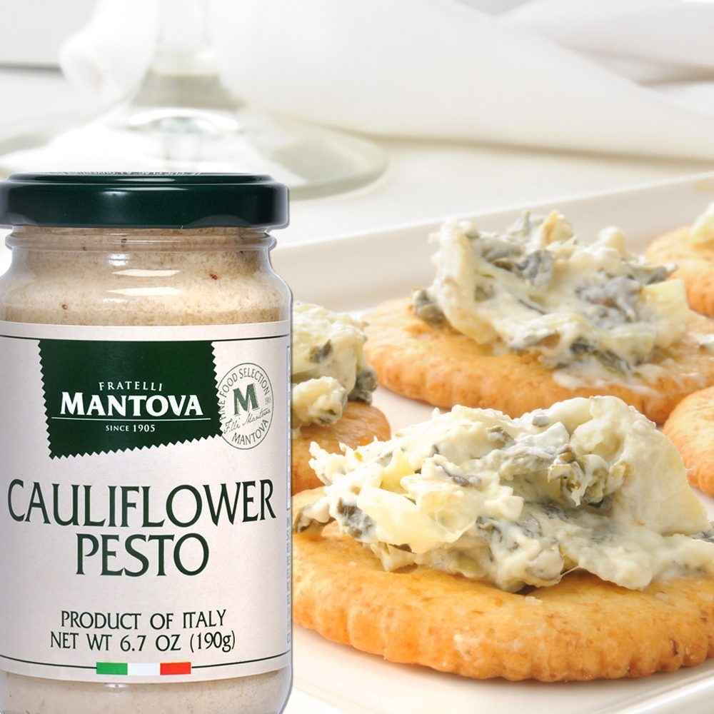 Through the generations, the Mantova family has become recognized as premier testers and tasters, curating only the finest spreads and toppings to bear the family name. Our Mantova Cauliflower Pesto is a new twist on a traditional Italian pesto recipe. A blend of fresh cauliflower, cheese, nuts, and oil. Easily enhance a simple pasta dish with a satisfying blend of flavors that’s perfectly authentic. Simply toss into spaghetti, macaroni, linguine, or any other pasta that you love. Or spread on top of pizza, toast or crusty bread. Instantly add authentic, exciting flavor no matter how you choose to enjoy it.