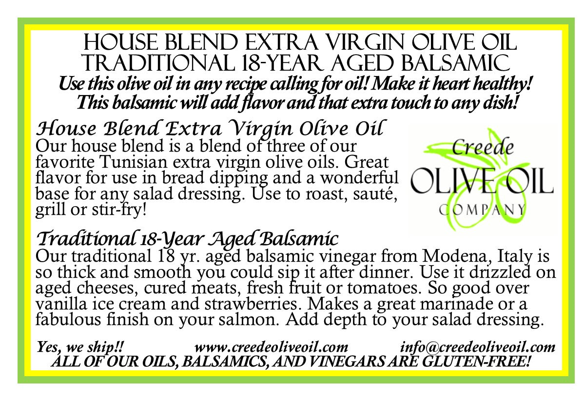 This special gift duo includes two full size 375mL bottles - one each of our traditional 18 year aged balsamic and one of our house blend extra virgin olive oil. Receive both at a discounted price with a free gift box with our custom Creede Olive Oil logo that fits both bottles, AND a printed recipe suggestion card for your duo!!