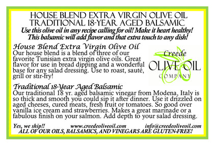 Our house blend oil is a blend of three of our favorite Tunisian extra virgin olive oils. What more can you ask for when it comes to food? Huge flavor for use in bread dipping and a wonderful base for any salad dressing.
